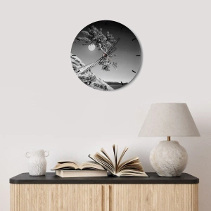 - Nástěnné hodiny s černobílou krajinou zobrazující osamělý strom na skále v měsíčním světle. Kompozice kombinuje sílu přírody s jemnou symbolikou. Ideální pro uklidňující a oduševnělé interiéry.
