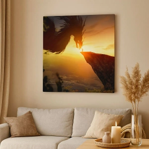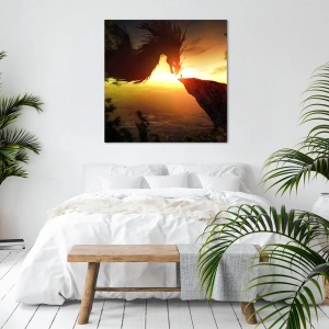 - Obraz zobrazuje mocného draka a muže stojícího na skále, obklopeného velkolepým západem slunce. Perfektní volba pro milovníky fantasy a jedinečných scén.