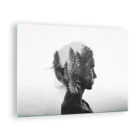 Obraz na skle - Žena v černé a bílé s překrývajícím se motivem jehličnatého lesa - 70x50cm - Paní borovicového lesa - Moderní nástěnná dekorace do obývacího pokoje a ložnice ARTTOR