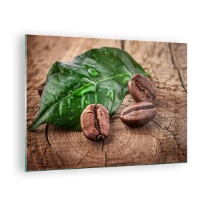 Obraz na skle - Kávová zrna na listu a dřevěném pozadí - 70x50cm - Nejskutečnější a černá - Moderní nástěnná dekorace do obývacího pokoje a ložnice ARTTOR