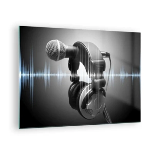 Obraz na skle - Mikrofon se sluchátky na pozadí zvukových vln - 70x50cm - Ještě je slyšet zpěv - Moderní nástěnná dekorace do obývacího pokoje a ložnice ARTTOR