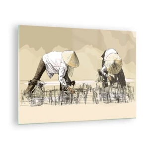 Obraz na skle - Minimalistická ilustrace pracujících farmářů - 70x50cm - Úspěšná sklizeň - Moderní nástěnná dekorace do obývacího pokoje a ložnice ARTTOR