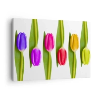 Obraz na plátně - Vícebarevné tulipány uspořádané v řadě na bílém pozadí - 70x50cm - Duhová kompozice - Moderní nástěnná dekorace do obývacího pokoje a ložnice ARTTOR
