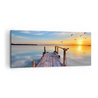 Obraz na plátně - Dřevěné molo při západu slunce na klidném jezeře - 70x50cm - Jít před sebe směrem ke slunci - Moderní nástěnná dekorace do obývacího pokoje a ložnice ARTTOR