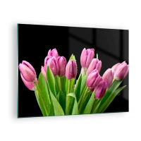 Obraz na skle - Kytice růžových tulipánů pokrytá kapkami vody na černém pozadí. - 70x50cm - Liliové potěšení jara - Moderní nástěnná dekorace do obývacího pokoje a ložnice ARTTOR