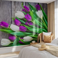 Fototapeta Standard Eco - Kytice bílých a fialových tulipánů na dřevě - 100x70cm - V den jarního svátku - Moderní nástěnná dekorace do obývacího pokoje a ložnice ARTTOR