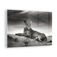Obraz na skle - Zůstal ležet v poušti v černobílém rámu - 70x50cm - Odpočinek královny pouště - Moderní nástěnná dekorace do obývacího pokoje a ložnice ARTTOR