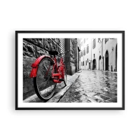 Obraz na skle - Červené kolo na dlážděné ulici s monochromatickým pozadím. - 70x50cm - Skutečná krása nestárne - Moderní nástěnná dekorace do obývacího pokoje a ložnice ARTTOR