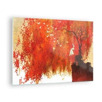 Obraz na skle - Červené listy, osamělý strom a ptáci v podzimní scéně - 70x50cm - Poletí s nimi? - Moderní nástěnná dekorace do obývacího pokoje a ložnice ARTTOR
