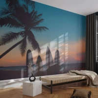 Fototapeta Standard Eco - Palma a surfy na pozadí západu slunce - 100x70cm - Zítra bude také zábava - Moderní nástěnná dekorace do obývacího pokoje a ložnice ARTTOR