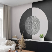 Fototapeta Standard Eco - Černá a bílá geometrická abstrakce s kruhy - 100x70cm - Harmonie v černé a bílé - Moderní nástěnná dekorace do obývacího pokoje a ložnice ARTTOR