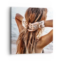 Obraz na skle - Žena s dlouhými vlasy na pláži, obklopená mušlemi a pískem. - 70x50cm - Sestra vody a slunce - Moderní nástěnná dekorace do obývacího pokoje a ložnice ARTTOR