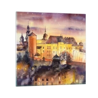 Nástěnné hodiny - Hrad za soumraku v teplých akvarelových barvách - 30x30cm - Historie a pohádka - Moderní nástěnná dekorace do obývacího pokoje, kuchyně a ložnice ARTTOR