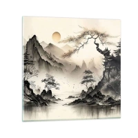 Nástěnné hodiny - Čínská tušová malba horské krajiny s pagodou a mlhavým údolím - 30x30cm - Jedinečné kouzlo orientu - Moderní nástěnná dekorace do obývacího pokoje, kuchyně a ložnice ARTTOR