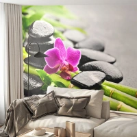 Fototapeta Standard Eco - Orchidejový květ na pozadí bambusu a černých kamenů - 100x70cm - V klidné rovnováze - Moderní nástěnná dekorace do obývacího pokoje a ložnice ARTTOR