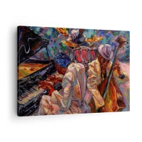 Obraz na plátně - Energická jazzová scéna s hudebníky a nástroji - 70x50cm - V jednom rytmu - Moderní nástěnná dekorace do obývacího pokoje a ložnice ARTTOR