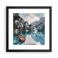 Nástěnné hodiny - Dřevěné molo a lodě na pozadí horského jezera - 30x30cm - Ukážeme vám krásu - Moderní nástěnná dekorace do obývacího pokoje, kuchyně a ložnice ARTTOR