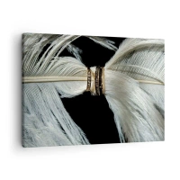 Obraz na plátně - Bílé pírko se dvěma zlatými kroužky na černém pozadí - 70x50cm - …a neopustím tě…. - Moderní nástěnná dekorace do obývacího pokoje a ložnice ARTTOR