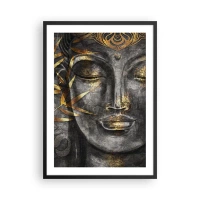 Plakát v černém rámu - Portrét Buddhy se zlatou záři a prvky bambusových listů - 50x70cm - Pociťte klid - Moderní nástěnná dekorace do obývacího pokoje a ložnice ARTTOR