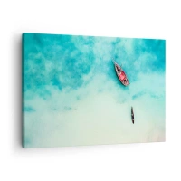 Obraz na plátně - Lodě na tyrkysové vodě z ptačí perspektivy - 70x50cm - Protože na plážích Zanzibaru, když je přebytek vody… - Moderní nástěnná dekorace do obývacího pokoje a ložnice ARTTOR
