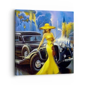 Obraz na skle - Žena ve žlutých šatech vedle veterána - 70x50cm - Nokturno pro housle a lásku - Moderní nástěnná dekorace do obývacího pokoje a ložnice ARTTOR