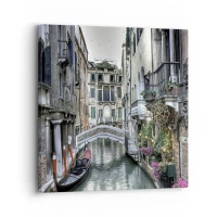 Obraz na plátně - Benátský kanál s gondolou a kamenným mostem - 70x50cm - Od staletí v tichém zamyšlení - Moderní nástěnná dekorace do obývacího pokoje a ložnice ARTTOR