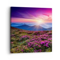 Obraz na skle - Horská krajina s vřesovištěm při západu slunce - 70x50cm - Zavoněly svěží pupeny bylinek z obilných polí - Moderní nástěnná dekorace do obývacího pokoje a ložnice ARTTOR