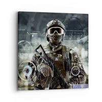 Obraz na skle - Voják v taktické výstroji na pozadí futuristického rozhraní. - 70x50cm - Ještě větší síla - Moderní nástěnná dekorace do obývacího pokoje a ložnice ARTTOR
