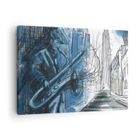 Obraz na plátně - Postava hrající na saxofon na pozadí města - 70x50cm - Městská rapsodie - Moderní nástěnná dekorace do obývacího pokoje a ložnice ARTTOR